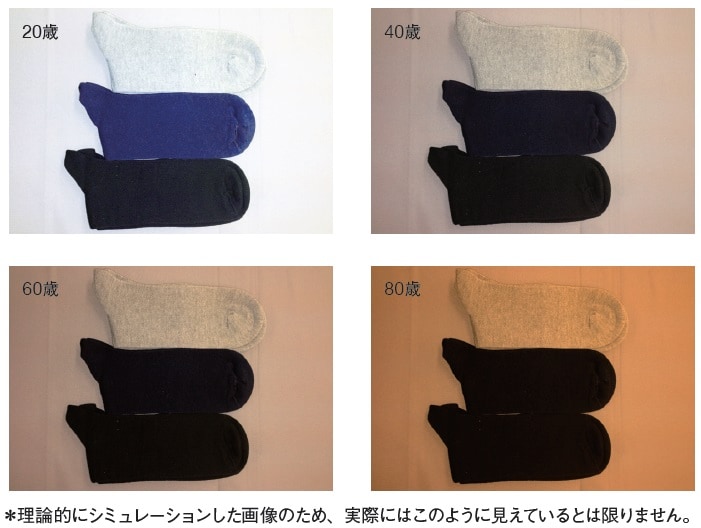 通常の照明下では、黒と紺の靴下を間違えることはありませんが、若い人でも低照度下や照明の色が違う場合などで間違えることがしばしばあります(図表3)。