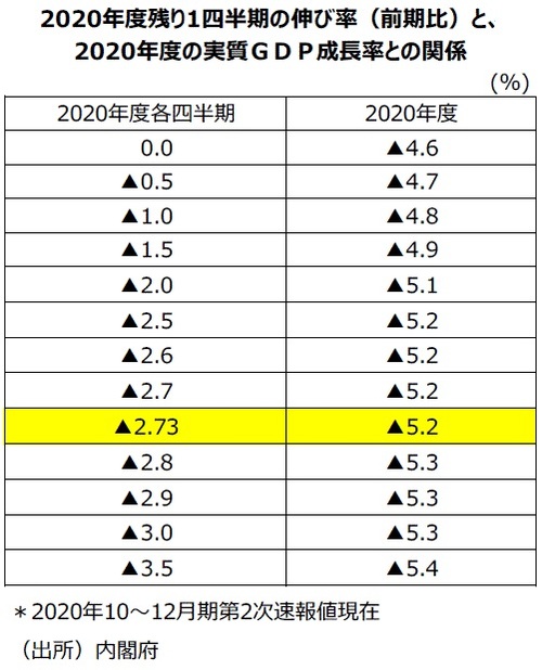 ●「令和3年度の経済見通し」の20年度実質GDP成長率実績見込み・前年度比▲5.2%を達成するには、20年度残り1四半期で前期比年率▲10.5%(前期比▲2.73%)が必要である。19年度から20年度へのゲタは▲1.3%である。なお、20年度残り1四半期の1~3月期は緊急事態宣言再発出されたためマイナス成長が見込まれている。1~3月期が前期比▲2.0%だと20年度実質GDP成長率・前年度比は▲5.1%のマイナス成長になる。前期比▲1.0%だと20年度実質GDP成長率・前年度比は▲4.8%のマイナス成長になる。仮に前期比0.0%だと20年度実質GDP成長率・前年度比は▲4.6%のマイナス成長になる。