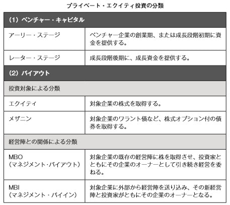 プライベート・エクイティ投資は、ベンチャー・キャピタルとバイアウト・ファンドに大別できる。ベンチャー・キャピタルは創業後間もないベンチャー企業などに投資するのに対し、バイアウト・ファンドは既存株主から株式を買収する。