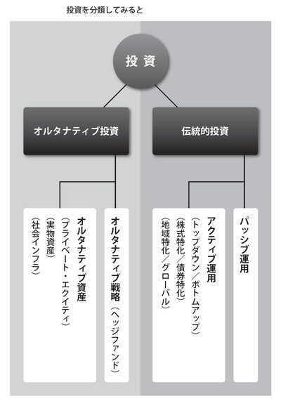 このように、定義の広いオルタナティブ投資は、オルタナティブ資産(不動産、コモディティ、インフラなど実物資産やプライベート・エクイティ)とオルタナティブ戦略(ヘッジファンド)に大別することができます。