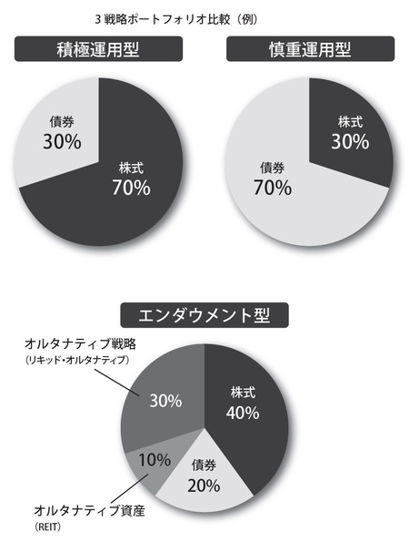 ①株式70%・債券30%の積極運用型 ②株式30%・債券70%の慎重運用型 ③株式40%主体に、債券20%・オルタナティブ資産(REIT)10%・オルタナティブ戦略(リキッド・オルタナティブ)30%と分散したエンダウメント型