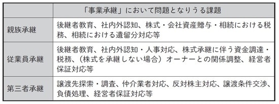 したがって、事業承継を支援する場合には、その事業承継の態様を確認した上で、それぞれにおいて生ずる問題を見極めて対応する必要があります。