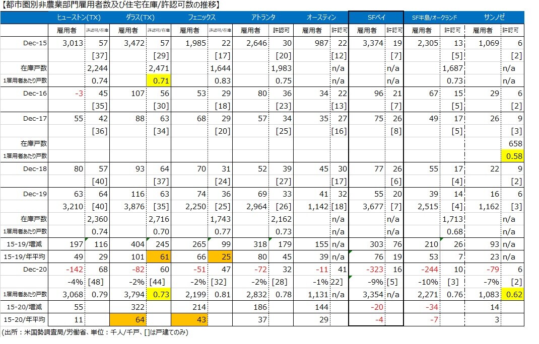 2015〜19年の増減と、2015〜20年の増減には、左欄にそれぞれ4年間および5年間の総数[単位:千人]、下欄には年平均の増減数[単位:千人]を示しています。比較のために、許認可発行に対する規制が厳しいSFベイエリア都市圏におけるそれらについても付け加えました。