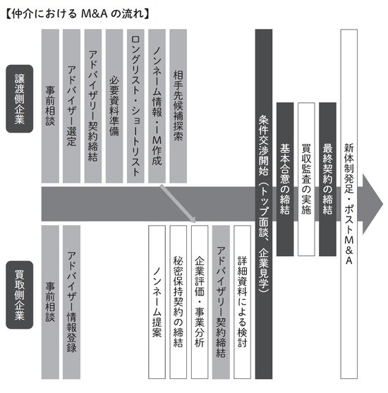 A. 仲介会社やFA(フィナンシャルアドバイザー)などの支援会社とコンサルタント(仲介)契約した場合には、下記の手順で進めていくことが一般的です。