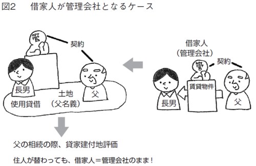 そのため、図1の借家人の場合と違い、住んでいる住人が引っ越しなどで入れ替わっても、賃貸物件の借家人は管理会社のままですので、「人に貸している土地」として評価減をすることができるのです。