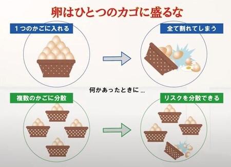 「卵をひとつのカゴに盛るな」という格言があります。卵を1つの籠に盛っていた場合、このカゴを落としてしまったら、卵はみんな割れてしまいますね。しかし、卵をいくつかの籠に分けて盛っていれば、籠を1つ落としてしまっても他の卵は助かります。これが、「分散」の基本的な考え方です。
