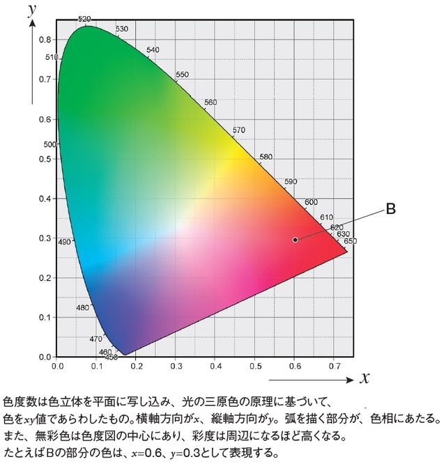 少し話が高度になりますが、視覚の学術分野では、色度図(図表7)というものを用いて、色を数値で測る方法をとっています。