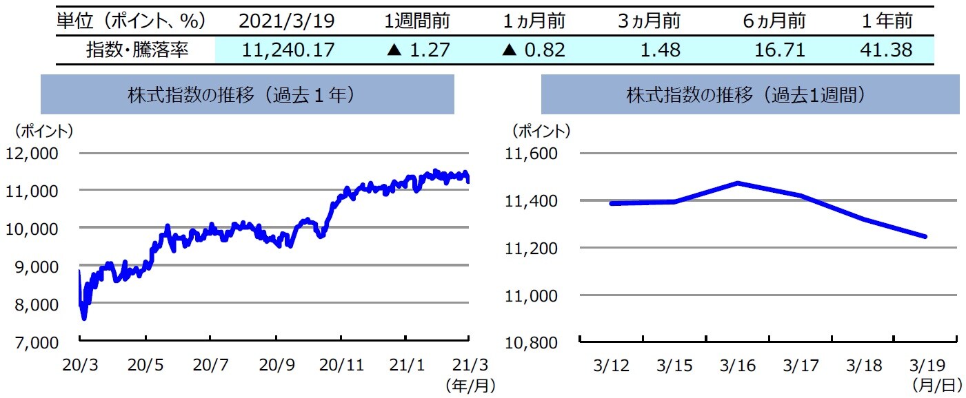 先週の豪州株式は、低下しました。米国追加経済対策などによる景気回復期待を背景とした長期金利の上昇や、FRBによる大手銀行の資本規制緩和の終了発表などを受けて米国株式が下落し、豪州株式も連られて下落しました。堅調な豪州雇用統計の結果など好材料もあったものの、週間では豪州株式は低下しました。