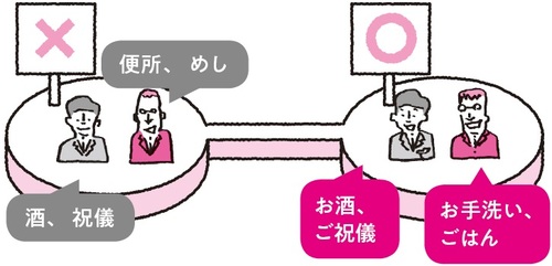 「お・ご・御」を接頭語につけることで美化語に。便所をお手洗いと言うように言葉自体を言い換える場合もある。
