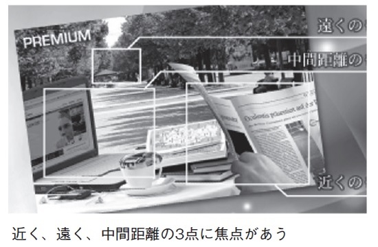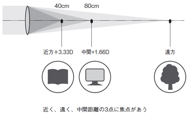 国内で認可されている多焦点レンズのトリフォーカルレンズは2焦点レンズの特徴と構造の組み合わせで「遠く」「中間」「近く」の3点に焦点があうのが特徴です(図表1、2)。
