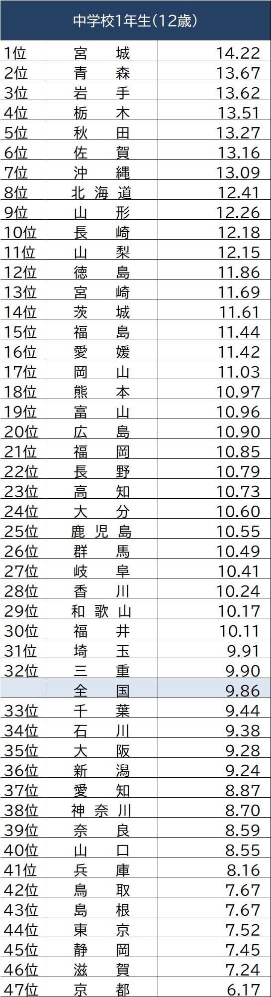 都道府県別「中学校1年生の肥満率」1~47位