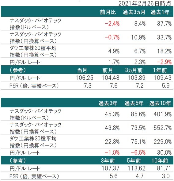 2月のナスダック・バイオテック指数(ドルベース、配当含まず)は下落しました。2月のバイオ医薬品市場は堅調なスタートを切ったもののその後は上昇の勢いを失い、月間では下落しました。新型コロナウイルスのワクチン接種は米国では順調に進んだものの、欧州では遅れも見られました。高水準の集団免疫が達成できるかどうかは、バイオ医薬品を供給している企業にとって特に重要です。この一年、患者の医療機関受診、そして医薬品の処方件数が落ち込んでいるためです。