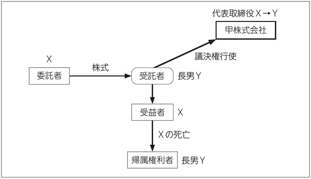 先の事例では、経営者Xを委託者兼受益者、長男Yを受託者、甲株式会社の株式を信託財産として、信託契約を締結するというスキームが考えられます。