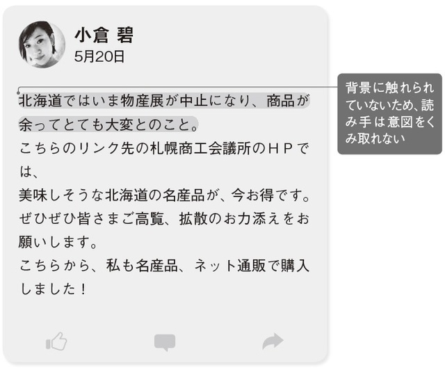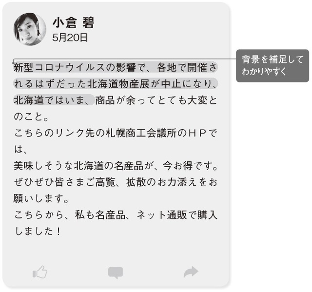 上記の投稿は、「新型コロナウイルスの影響で、各地で北海道物産展が中止に追い込まれていること」が背景となっている。ならば、その背景にはきちんと触れたほうがいい。