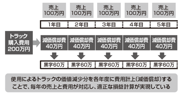 適正な損益計算をするためには、その年の売上高に対して計上する経費は、売上高を得るために費やされたものを対応させるべきです。そこで、その年の売上を得るためにトラックを使用することで減少した価値部分を、費用(これを「減価償却費」と言う)として計上することで、売上と経費のバランスが適正なものとなり、適正な税金計算にもつながります。