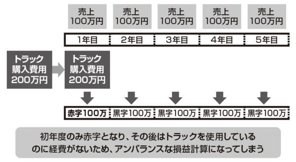 このように、トラックを購入した年に全額経費に計上した場合には、初年度だけ赤字で、2年目以降はトラックを使用しているにもかかわらず経費は0円となり、全体としてアンバランスな損益計算となってしまいます。そこで、この損益計算のバランスを取るために「減価償却」という方法を用います。