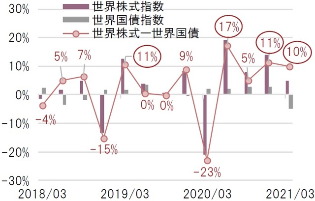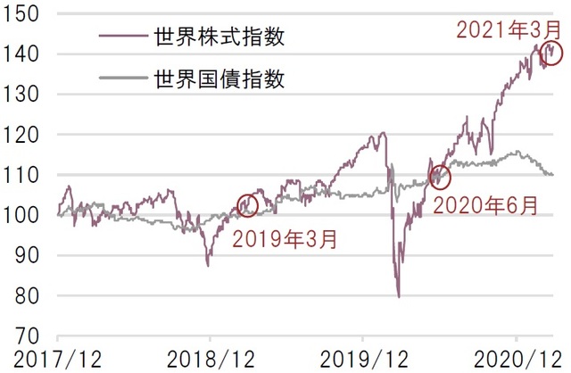 今回のように世界株式と世界国債のリターン差異が比較的大きくなった局面(+10%以上)は、2017年12月末以降で計3回あった(2019年1-3月期、2020年4-6月期、2020年10-12月期)。そのうち、実際に期末にかけて株安となった局面は2019年1-3月期と2020年4-6月期の2回だった。今回も期末にかけて弱含んでいることを勘案すると、「ポートフォリオ・リバランス」に伴う株安圧力が全くないとは言い切れないだろう。