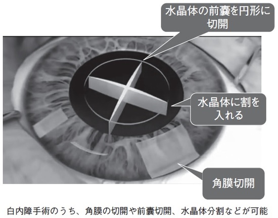 水晶体を包んでいる前嚢の切開でいえば、通常の手術で正確な円に切開するには熟練の技術が必要です。ある程度実績のある眼科医でも、患者の眼の状態などによって、いつも同じように切れるとは限りません。その点、レーザーであれば、いつも同じように高水準の切開ができます。