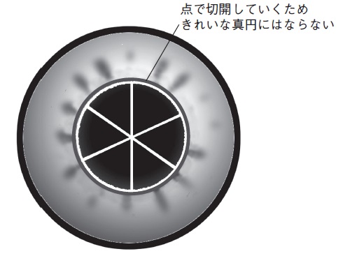 切り口がなめらかで、なおかつ眼内レンズを入れた状態で真円になるようなベテラン医師の「100点満点」の切開は、レーザーにはまだ望めない状態です。そこが、私が「90点止まり」と判断する理由です。