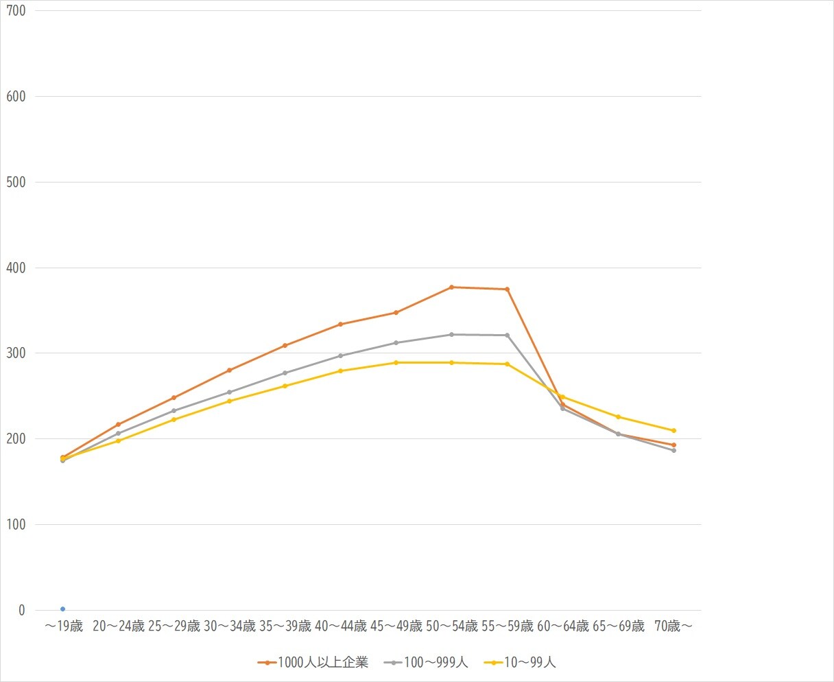 中央値ではどうでしょうか。1000人以上企業と10~99人企業で最も差が大きくなるのは、「50~54歳」で8万8300円。下位25%と比較すると差は大きくなってきました(図表3)。