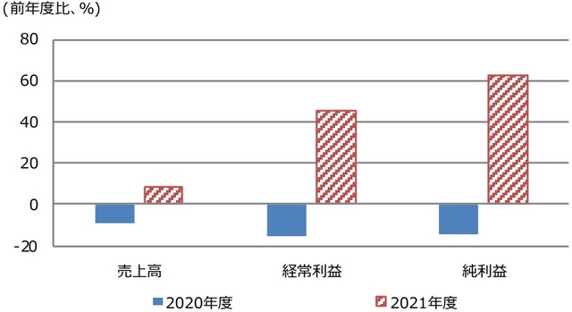 ●2021年度の売上高は前年度比+8.4%、純利益は同+62.4%と、明確な業績回復を見込む。
