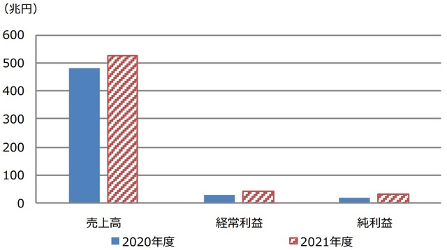 はじめに、前年度、すなわち2020年度の着地を確認します。2020年度の売上高は484.3兆円、経常利益は28.3兆円、純利益は17.6兆円を見込んでおり、前年度比の伸び率は、順に-8.7%、-15.8%、-14.7%と、減収減益の予想です(図表1、図表2)。