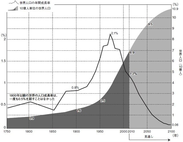 ここにもまた18世紀から上昇を開始し、20世紀半ばにピークを迎えたのちに急速に減速していくという、急峻な山型カーブの相似形を確認することができます。言うまでもなく、経済の規模を確定する需要の総量は最終的には人口に左右されることになるわけですが、その人口の成長率はすでに50年前にピークを過ぎ、近い将来にはほとんど増加しない「定常状態」になると考えられているということです。
