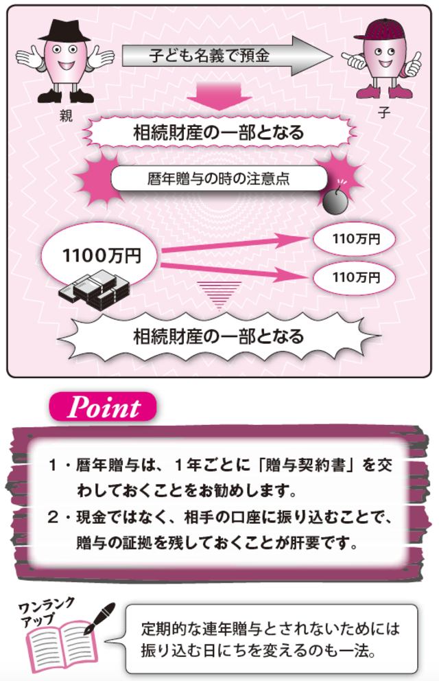 年に110万円の贈与には贈与税はかかりませんが、単に贈与したい相手の名義で預金しただけだと、贈与税がかかることがあります。