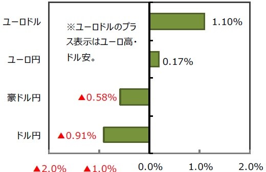 円相場は対米ドルでは、パウエルFRB議長の発言を受けた緩和的金融政策の長期化観測を受けて、米長期債金利が低下したことなどから、0.91%の円高となりました。対ユーロでは0.17%の円安となりました。