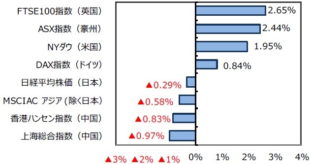 米国の債券市場は、米連邦準備制度理事会(FRB)のパウエルFRB議長の発言を受けた緩和的金融政策の長期化観測が高まり、長期債利回りは週間で0.056%低下しました。日本、英国の10年国債利回りも低下しました。
