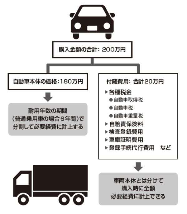 例えば、自動車を購入した場合、税金(自動車取得税、自動車重量税、自動車税)や自賠責保険料、検査登録費用や車庫証明費用、登録手続きの代行費用などは、付随費用として本体の価格と分けて経費に計上できます。