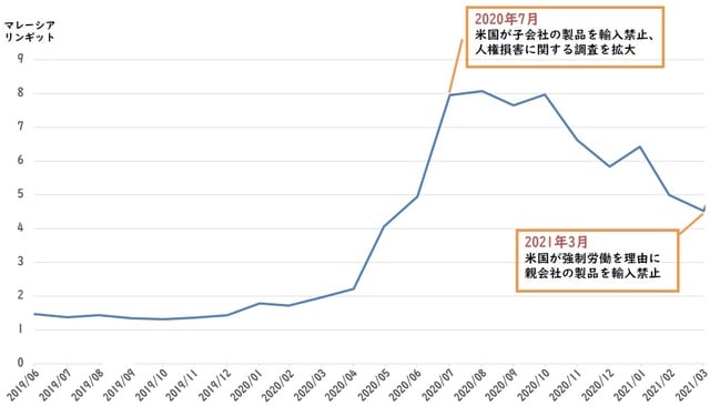 同社にとって米国市場は売上の約20%を占めていたため、【図表】で見られるように、同社株価は昨年付けた高値の1株8リンギットから2021年3月末時点の4.5リンギットまで大幅に下落し、企業価値が失われました。