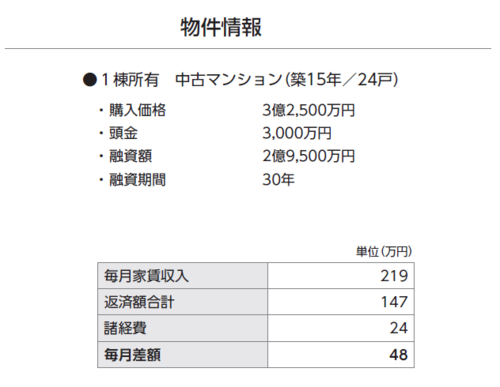 物件は築15年、24戸のマンション1棟です。価格は3億2500万円ですが、頭金3,000万円を入れればローンの返済を差し引いても毎月約48万円の収益が残ります。