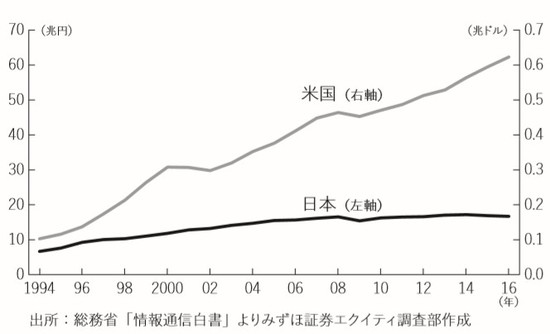 IT投資については、2016年までの10年間に米国のIT投資が実質50%以上伸びたのに対して、日本のIT投資は7%しか伸びませんでした(【図表1】)。
