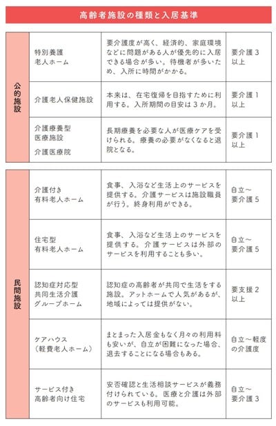施設の種類は非常に多く、判断に困惑するかもしれません。公的施設は、介護保険施設とも呼ばれ、特別養護老人ホーム、介護老人保健施設、介護療養型医療施設(令和5年度末廃止)、介護医療院がそれに当たります。これらの施設は要介護以上の認定が必要で、所得による軽減措置もあり比較的低コストで入居ができますが、皆が入居したいと思っているため、入居まで時間がかかる場合があります。