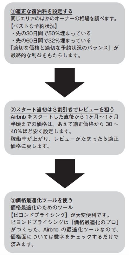 稼働率が上がればレビューは増えていきますから、そこで適正価格に戻します。レビューがたまればたまるほどそれに比例して予約率は上がってくるため、とにかく最初はレビューを上げることに注力しましょう。