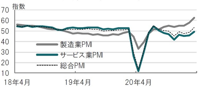 ラガルド総裁はPEPPの資産購入について6月以降の方針は議論されず、今後を決めるのは時期尚早と述べています。これはユーロ圏にはどちらの方向に向かうか判断を待つ必要がある要因が多いからと思われます。例えば、会見でラガルド総裁が引用したユーロ圏のサービス業購買担当者景気指数(PMI)は3月が49.6と、新型コロナの影響で、景気判断の分かれ目である50を下回っています(図表2参照)。