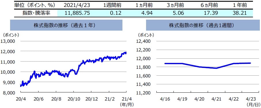 先週の豪州株式は、ほぼ横ばいとなりました。世界的なコロナの感染拡大による景気回復の遅れが懸念されたことなどで主要株式市場は概ね下落し、豪州株式も週の半ばに下落しました。週後半には3月の小売売上高の速報値が市場予想を上回ったことを受けて、多少反発し豪州株式はほぼ横ばいとなりました。
