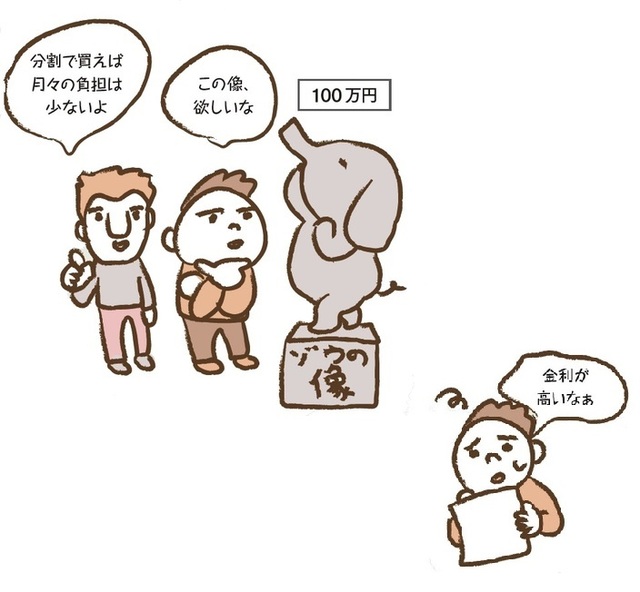 分割払いは買い物ごとに「支払い回数」を指定する支払い方法です。3回払い以上は手数料がかかりますから、1回払いに比べて支払総額は多くなります。