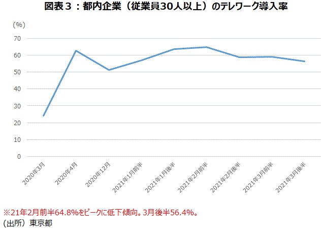 人流を抑制するために、政府や自治体は出勤者数の「7割削減」を目標に掲げているが、3度目の緊急事態宣言期間の最初の平日である4月26日では、東京や大阪の主要駅では通勤客の目立った減少は見られなかったと報道された。東京都は、従業員30人以上の都内の企業を対象にテレワーク導入率を調査している。20年3月に24.0%だった導入率は、最初の緊急事態宣言発令後の昨年4月に62.7%に上昇した。その後12月には51.4%に低下したが、今年1月に2回目の緊急事態宣言が発令されると1月後半63.5%、2月前半は64.8%と再び60%台に上がった。しかし、そこがピークで低下傾向になり、解除後の3月後半には56.4%まで下がっている(図表3)。