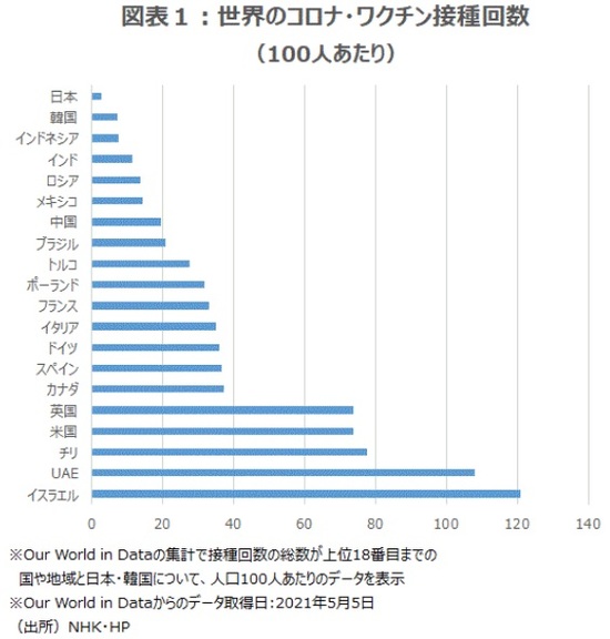 NHKのHPに掲載されている日本の新型コロナウイルスのワクチン接種回数(100人あたり)は、5月6日に取得したデータで2.8回にすぎず、最も多いイスラエル121.0回、米国の74.1回、ドイツの37.6回に比べかなり少ない(図表1)。今後、接種回数のペース改善が望まれる。