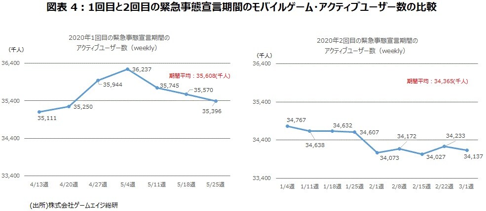 2回目の緊急事態宣言期間では、自粛の中、モバイルゲームを遊ぶというスタイルは1回目の時に比べると少なくなった。2回目の緊急事態宣言では「自粛慣れ」が言われ、1回目の緊急事態下よりも社会活動が活発であった印象だが、モバイルゲームのアクティブユーザー数からもそれが裏付けられた結果となった(図表4)。