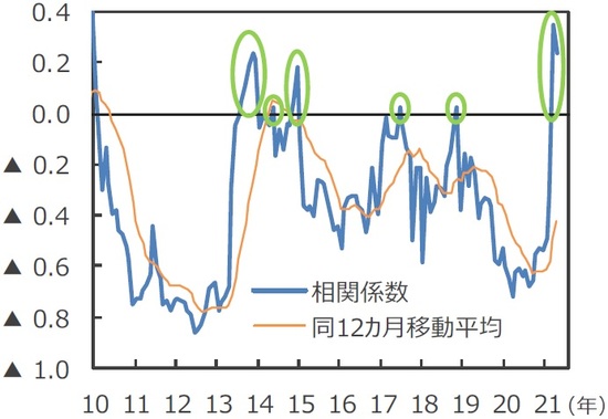 ■相関係数は再びマイナス圏に転換すると考えられます。弊社では、経済の正常化に合わせて緩やかに長期金利が上昇すると見ていますが、同時に企業業績の回復を背景に株価は堅調に推移すると予想しています。この場合、債券価格が下落し、株価が上昇することになり、相関係数はマイナスとなります。プラス圏にとどまるとすれば、それは景気の過熱による引き締め懸念を背景に債券価格の下落と株価の下落が再現するか、もしくは、景気回復の見通しが後退し、金融緩和環境の下で、債券価格が上昇(長期金利が低下)し、株価も上昇するということになります。いずれの可能性も考えられますが、経済の正常化という大きな局面変化の中で、それらの持続性は限られそうです。