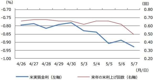 ここで、米実質金利の動きを確認してみると、5月7日の雇用統計の発表を受け、マイナス幅は前日からやや拡大しました(図表2)。