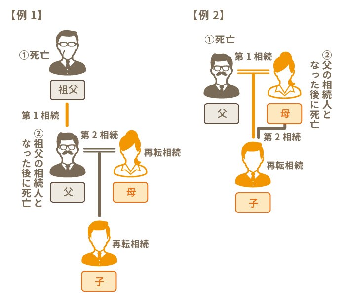 再転相続とは、1回目の相続の相続人が相続を承認するか放棄するか判断しないまま死亡したことで、2回目の相続が始まることをいいます。具体例としては、【図表1】の例1と例2に示すようなケースがあります。