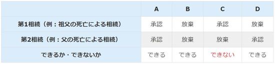 第1相続と第2相続のどちらを承認してどちらを放棄するかの組み合わせは、【図表2】のA~Dに示す4通りが考えられます。ただし、Cのように相続人が第2相続を放棄した場合は、第1相続を承認することができません。