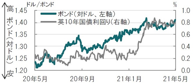 [図表2]英国ポンド(対ドル)と英10年国債利回りの推移 日次、期間:2020年5月11日~2021年5月10日