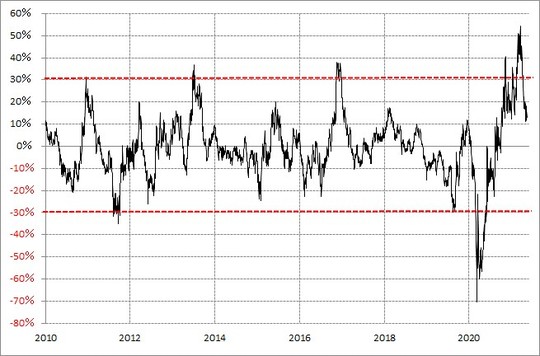 米インフレ懸念に対して、米金利が上昇一辺倒とならず、米金利と連動してきた米ドル/円も上げ渋るところとなったのは、90日MAとの関係などで見ると、依然として「上がり過ぎ」圏にある米金利の、目先的な上昇の限界を示したということでしょう。