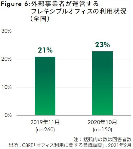 先に挙げたテナントに対するアンケート調査によると、フレキシブルオフィスをすでに利用している回答者の割合は21%から23%に増加している(Figure6)。