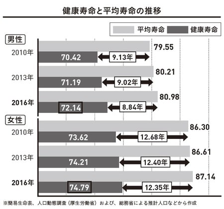 日本人の平均寿命の長さは昔から知られたことですが、健康寿命の短さには驚いた人も多いのではないでしょうか。男性は72歳、女性は74歳、それ以後は誰かのサポートがなければ生きていけない現実があるということです。